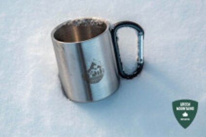 "The high-quality stainless steel metal mug with carabiner handle is your perfect companion for hot and cold drinks in the mountains."